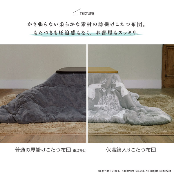 - 省スペースタイプの薄手のを使ってたので、こちらはとてもフワフワで暖かいです。普通のこたつ布団よりは広がらないので、あまり邪魔にならないと思います。 75×75の天板でちょうど良い大きさでした。
