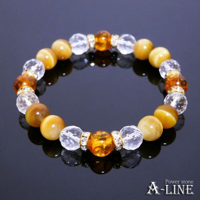 パワーストーン ブレスレット アンバー(琥珀)&AAAゴールデンタイガーアイ&64面カット水晶8mm PW-3025