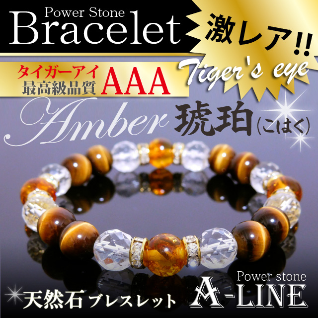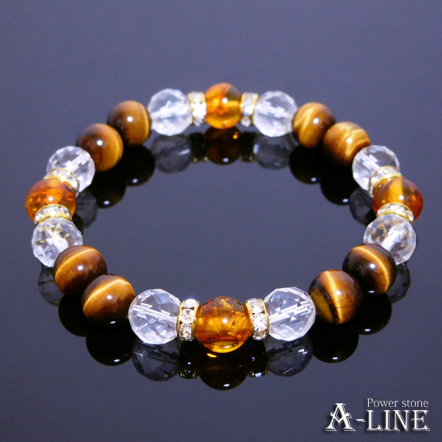 パワーストーン ブレスレット アンバー(琥珀)&AAAタイガーアイ&64面カット水晶8mm PW-3027
