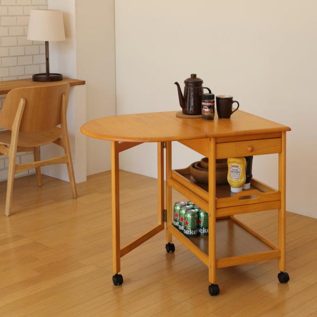 キッチンワゴン 幅42.5〜85cm キャスター付 木製ワゴン バタフライ 片バタ ( キッチン 収納 天然木 作業台 台所 北欧 トレー 3段 折りたたみ 配膳 ワゴン 木製 キッチン収納 おぼん 盆 ブラウン ナチュラル )