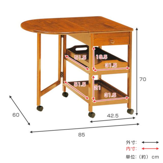 | サイズ | 約 幅85×奥行60×高さ70(cm) 本体(折りたたみ時):約 幅42.5×奥行60×高さ70(cm) 引き出し内寸:約 幅28.5×奥行24×高さ5(cm) トレー内寸:約 幅28×奥行51.5×高さ2.5(cm) 棚内寸(上):約 幅31.5×奥行51.5×高さ19.5(cm)(トレー取り外し時) 棚内寸(下):約 幅31.5×奥行51.5×高さ21(cm) |