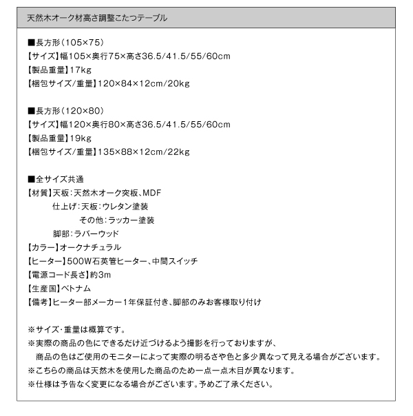 4段階で高さが変えられる!天然木オーク材高さ調整こたつテーブル 【Ramillies】ラミリ 長方形(105×75cm) オークナチュラル