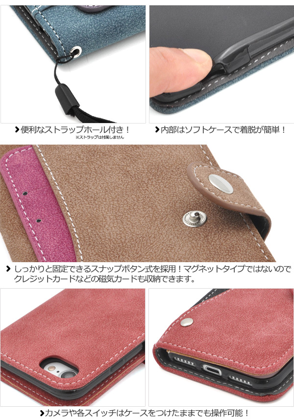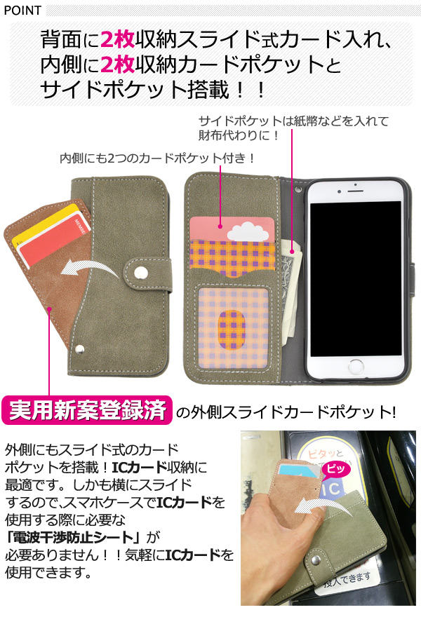 | 背面に2枚収納スライド式カード入れ、内側に2枚収納カードポケットとサイドポケット搭載した、iPhone 7用スライドカードポケットソフトレザーケース 背面にもスライド式のカードポケットを搭載!(実用新案登録済) ICカード収納に最適です。しかも横にスライドするので、スマホケースでICカードを使用する際に必要な「電波干渉防止シート」が必要ありません!!気軽にICカードを使用できます。滑らかな手触りソフトレザーデザイン。持つ度に手にしっくりと馴染みます。背面を折り返すとスタンドとして使用できるので、動画視聴に便利です。落下防止に便利なストラップホール付きです。 横開きタイプなので、手帳のように使うことができます。しっかりと固定できるスナップボタン式を採用!マグネットタイプではないのでクレジットカードなどの磁気カードも収納できます。 ※iPhoneは付属しません。 ※ライセンス商品ではありません。 | ||||||||||
