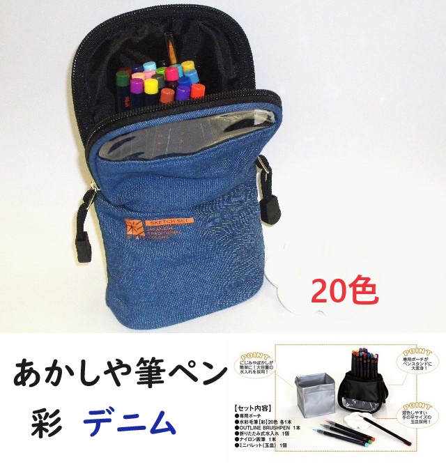 あかしや筆ペン カラー筆ペン 20色 デニムケース 7300円 絵手紙 水彩毛筆 彩 スケッチセット CA550S 筆洗 細筆 パレット 送料込