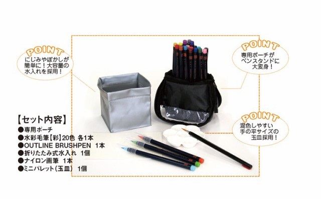 水彩毛筆20色・墨色筆ペン(1本)・水入れ(1個)・画筆(1本)・パレット(1個)