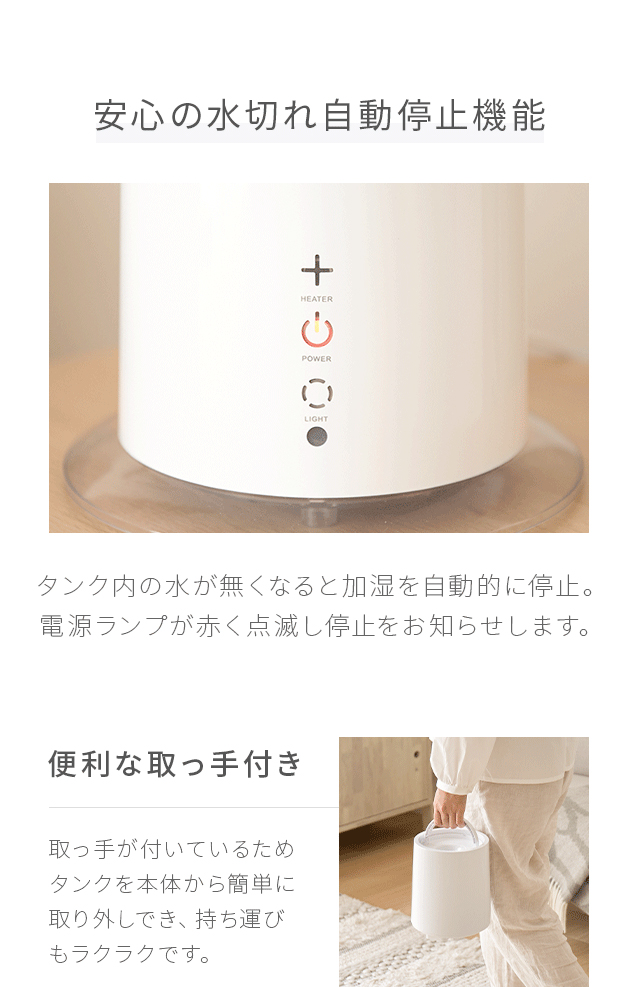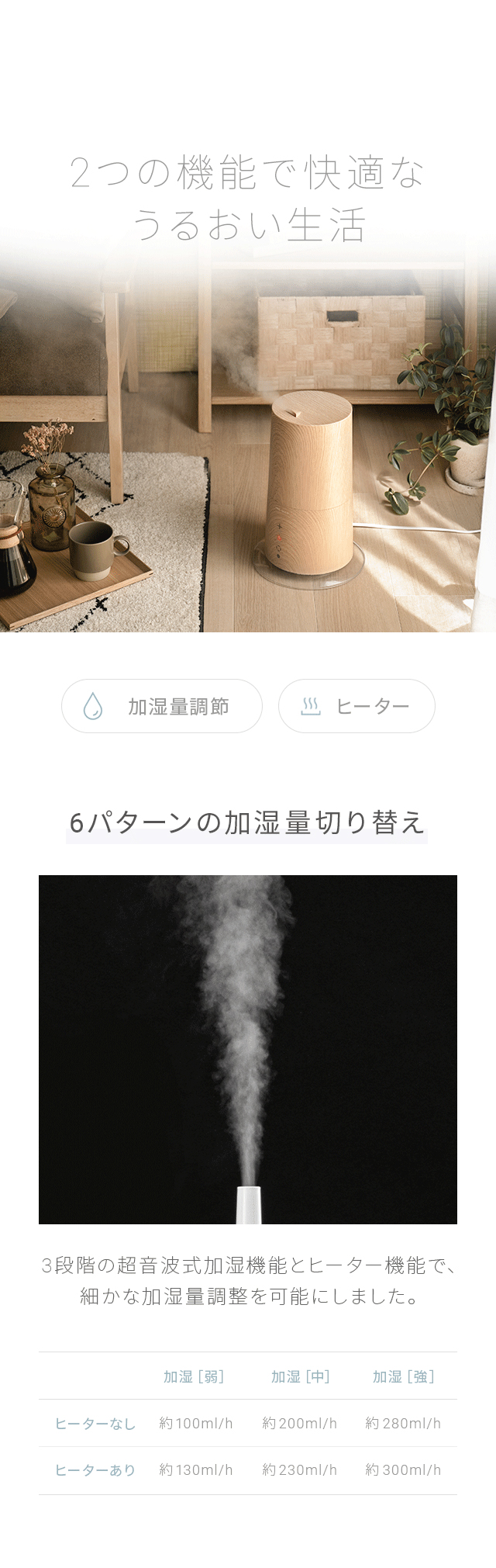 加湿量は【弱・中・強】の3パターンを【加熱/非加熱】でお選びいただけます。