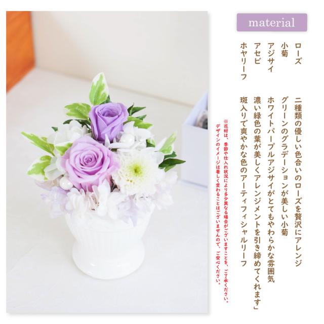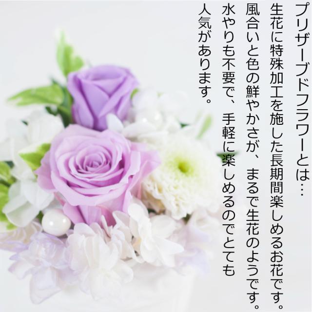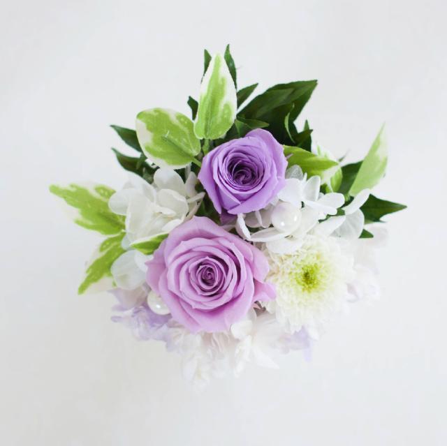 ローズ、小菊、アジサイのプリザーブドフラワーを白と淡い紫を使い、