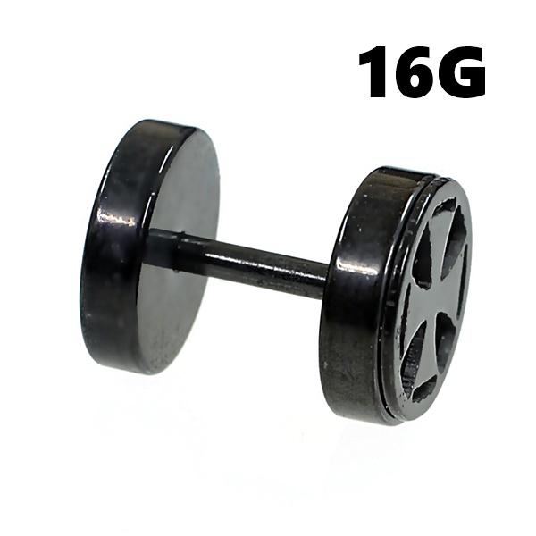 ブラック アイアンクロス プレート フェイクプラグ/フェイクバーベル ストレートバーベル 【16G/1.2mm】