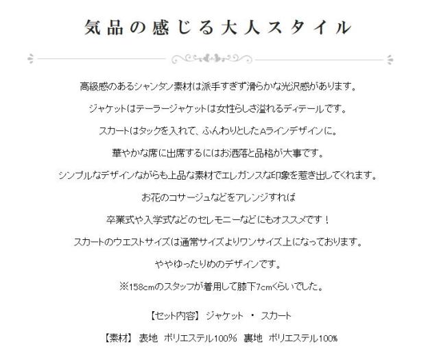 - 卒入学式に何度も出る機会があり、無地のスーツしか持っていなかったので、今回こちらを購入。ジャケットの生地が少し薄めかなぁと思いましたが、デザインもスカートもかわいかったです。
