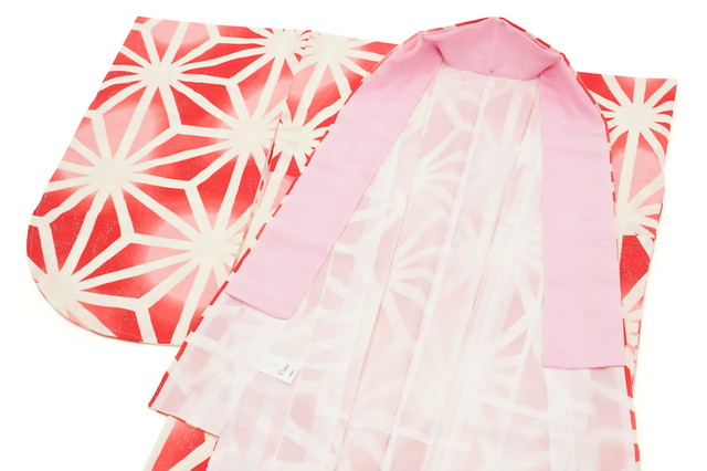 袴用二尺袖着物 赤橙 レッドオレンジ 白 麻の葉 ぼかし 重衿付き レトロモダン 小振袖 袴用 卒業式 謝恩会 女性 レディース 仕立て上がり