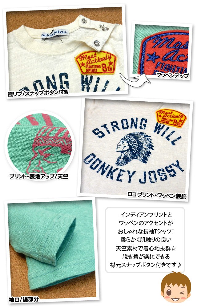【送料無料】ベビー服 男の子 Tシャツ 長袖 Donkey Jossy ドンキージョッシー 天竺 インディアンプリント 男児 ベビー 90cm 95cm【メール便対応】