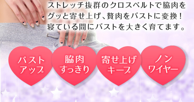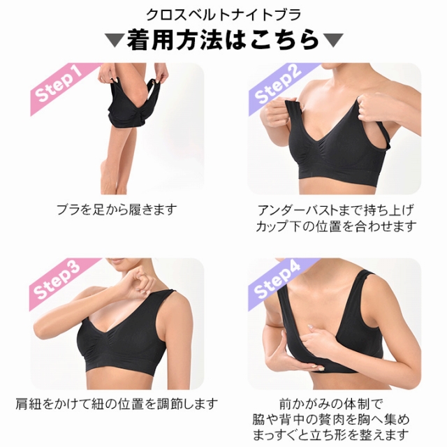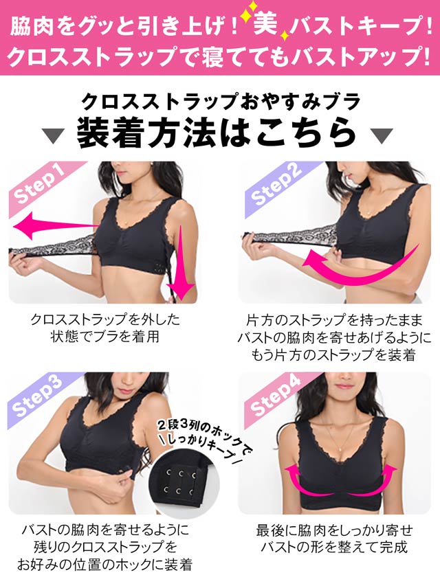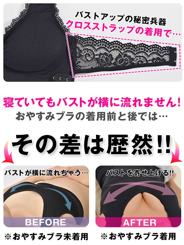 つけて眠るだけで、バストアップ効果が期待できちゃうおやすみブラ(ナイトブラ)♪ おやすみブラにはめずらしい『クロスストラップベルト』付!