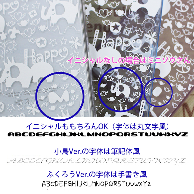 ※イニシャルは小鳥/筆記体風、梟/手書き風、ゾウさん/丸文字風の文字で入ります。