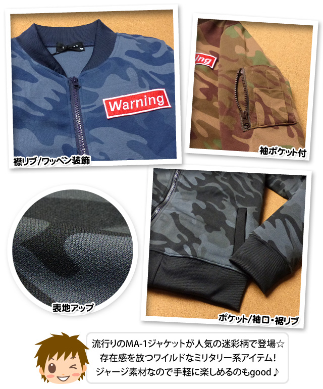 子供服 男の子 アウター フルジップ MA-1 ジャケット SHISKY ジャージ素材 迷彩柄 ワッペン装飾 男児 ジュニア