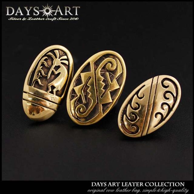 黄金色のブラスプレートにココペリや水、山を表すネイティブインディアン独特の民族模様が彫刻されたブラスコンチョです。オーバーレイのようにデザインされており、使い込むほどにエイジングによって味わいが増します。裏面はネジ式になっているので装着も簡単なカスタムコンチョです。