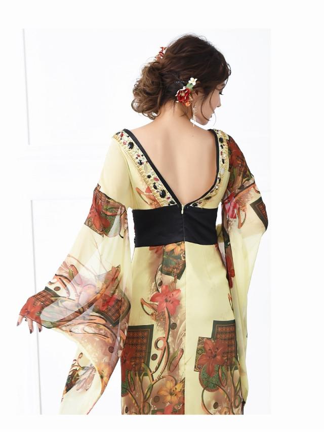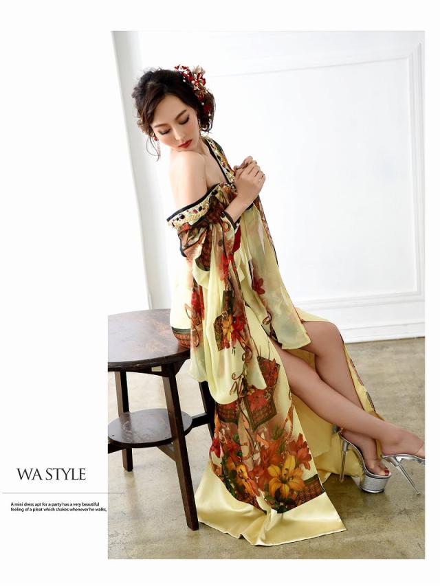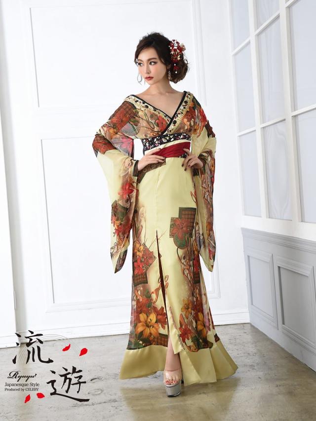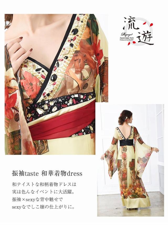 和柄ドレス 流遊 花魁 和柄ドレス シフォン 着物ドレス 百合柄 花魁 コスプレ 花魁コスプレ 衣装 着物ドレス 着物 和柄ド