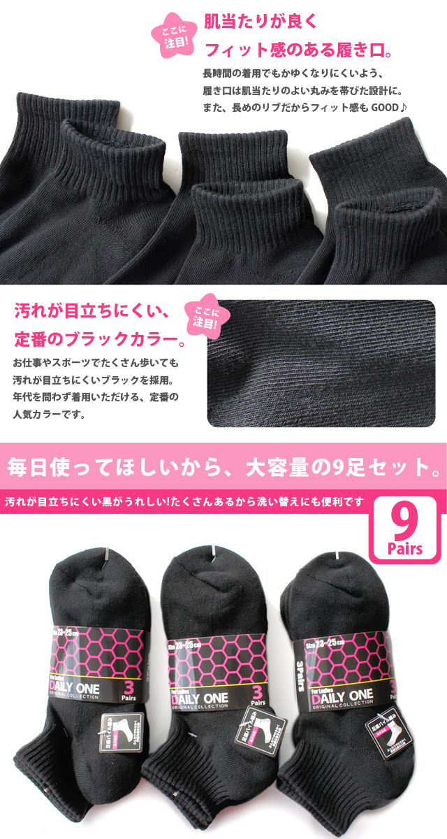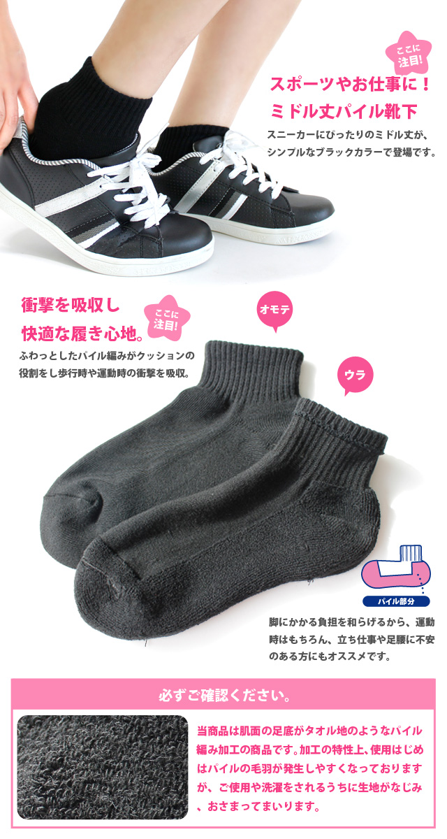 【送料無料】レディース | 足底パイル編み ミドル丈丈靴下 ブラックカラー スニーカー ソックス 9足セット | スポーツ 運動 黒