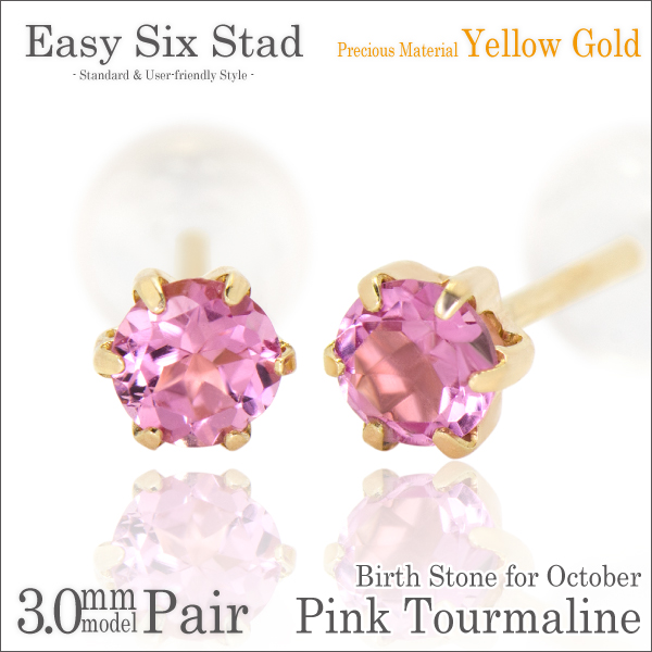 ピンクトルマリン ピアス 送料無料 K10 イエローゴールド 3mm 薄型6本爪 スタッド 両耳ペア ダブルロックキャッチ付