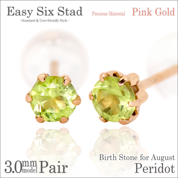 ペリドット ピアス 送料無料 K10 ピンクゴールド 3mm 薄型6本爪 スタッド 両耳ペア ダブルロックキャッチ付