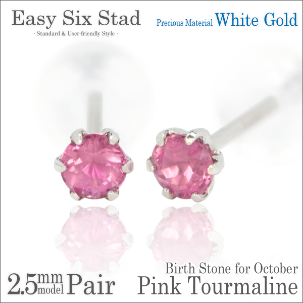 ピンクトルマリン ピアス 送料無料 K10 ホワイトゴールド 2.5mm 薄型6本爪 スタッド 両耳ペア ダブルロックキャッチ付