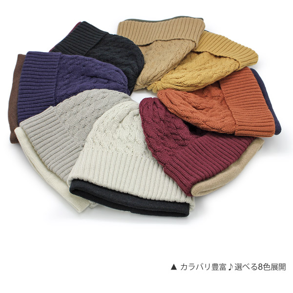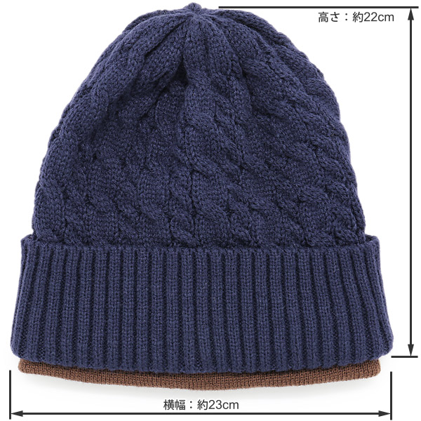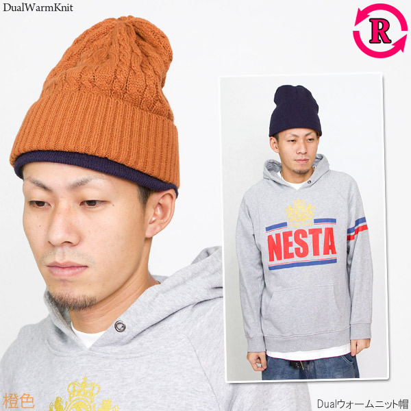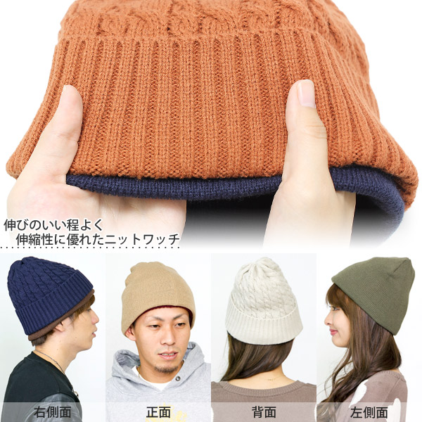 伸びのいい程よく伸縮性に優れたニットワッチです。表裏使用できる便利なリバーシブル仕様なのですが、面白いのはそのデザイン!片方は立体感のある冬の定番ほっこりとした縄編み、もう片方はまったく雰囲気の違うシンプルなプレーンワッチに、裏面からリブニットを折り返した新しい発想のデザイン!表裏全く違うデザインですので、コーデの幅も広がりますね。サイズ感もよく二重構造の為保温効果も抜群です☆