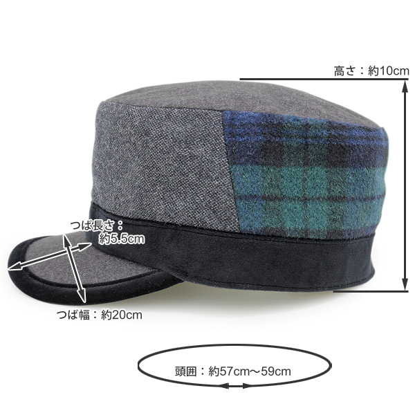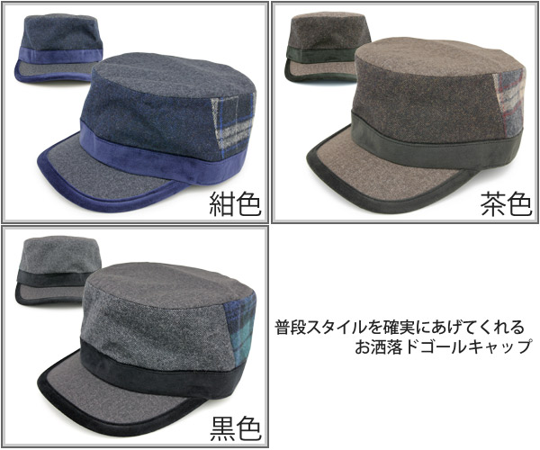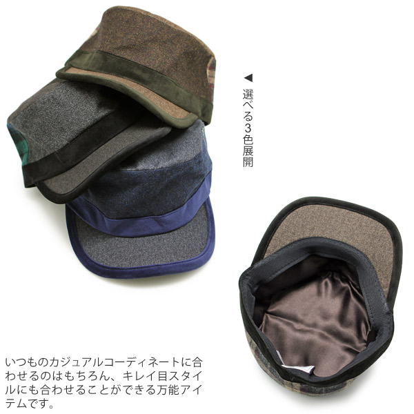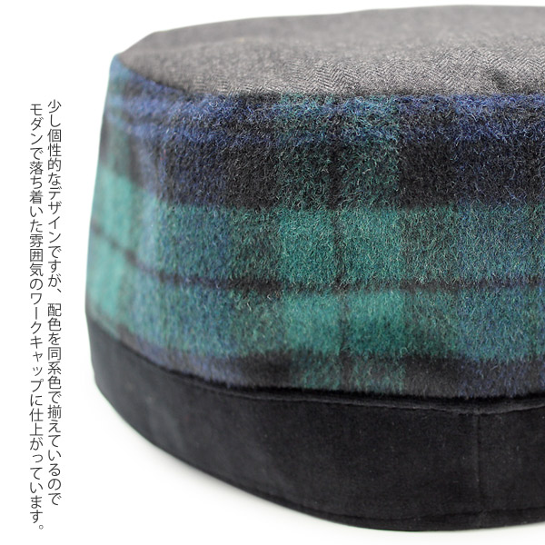 少し個性的なデザインですが、配色を同系色で揃えているのでモダンで落ち着いた雰囲気のワークキャップに仕上がっています。フランネル・ツイード・ベロアと3種類の生地を使用した切替えタイプの帽子で、コーディネートを引き立てる魅力があり、ちょっとしたプレゼントなどにも最適です。いつものカジュアルコーディネートに合わせるのはもちろん、キレイ目スタイルにも合わせることができる万能アイテムです。帽子内側のマジックテープ紐でサイズ調整できるので、被り心地を重視したいという方にオススメの一品です。
