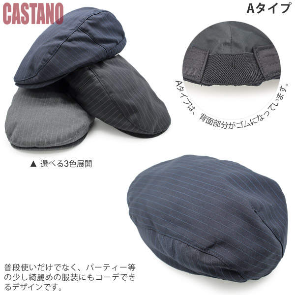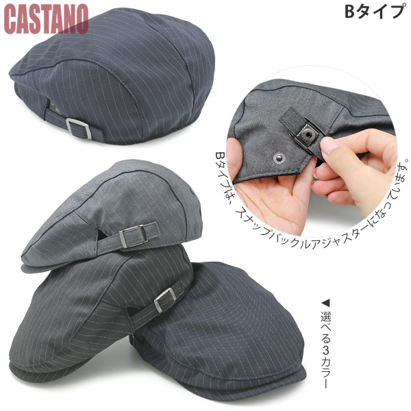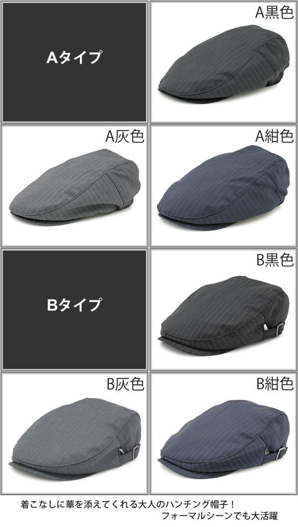 スーツのようになめらかなボディにストライプが効いた、大人の渋さが魅力のハンチング帽子です。カジュアルな普段使いには勿論、フォーマルシーンでも十分使えるデザイン、ジャケットの着こなしにプラスしてお洒落に決めてください。内側の背面部分がゴムになっているAタイプと、両サイドがスナップバックルアジャスターになっているBタイプ。どちらのタイプも被った際、頭のカタチに適度にフィットするよう作られていますのでお好みでお選びいただき、あなたらしいセンスが輝く秋冬ファッションをお楽しみください。