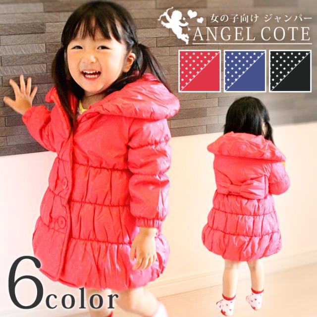 ふんわりとした女子好みのシルエットで、背中に可愛らしいリボンをあしらったポリエステル100%のジャケットコートです。左右にポケットを付けているので、キャンディーを入れてたら子供が喜ぶかも♪キュートな水玉模様とシンプルなベーシックカラーをご用意。お好きな方をお選び下さい。