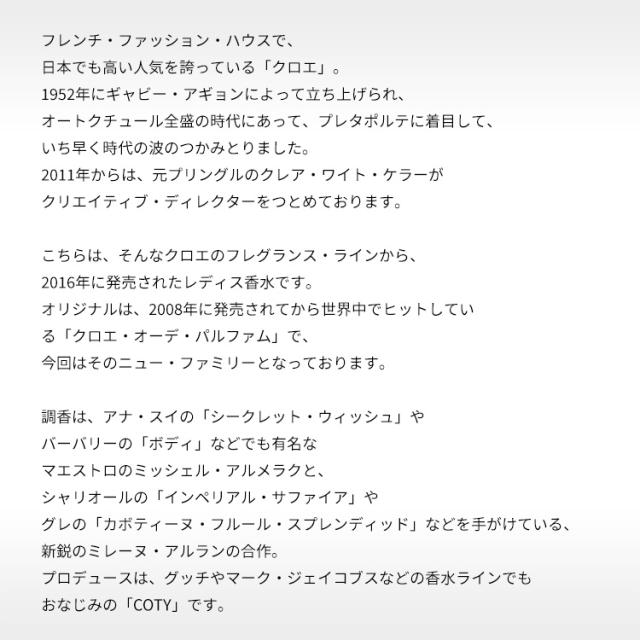 こちらは、そんなクロエのフレグランス・ラインから、2016年に発売されたレディス香水です。オリジナルは、2008年に発売されてから世界中でヒットしている「クロエ・オーデ・パルファム」で、今回はそのニュー・ファミリーとなっております。