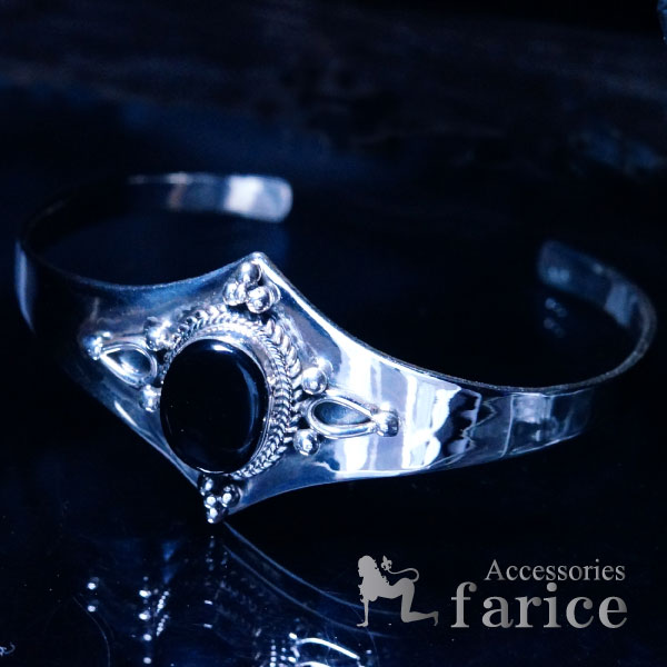 オニキス&ツタ&縄目立体装飾 ダイヤモンド型フレーム メンズ インディアンジュエリー シルバー925 バングル ブレスレット