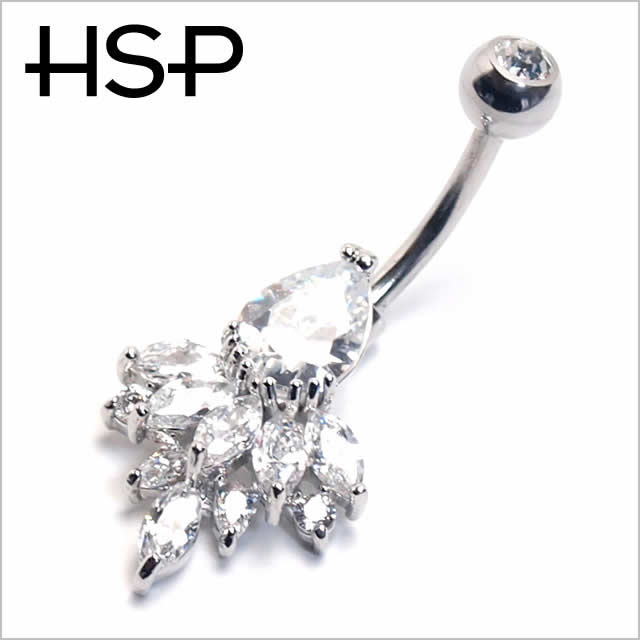 女性に人気のティアドロップとりリーフ型のジュエルを使ったへそピアス(バナナバーベル)です。