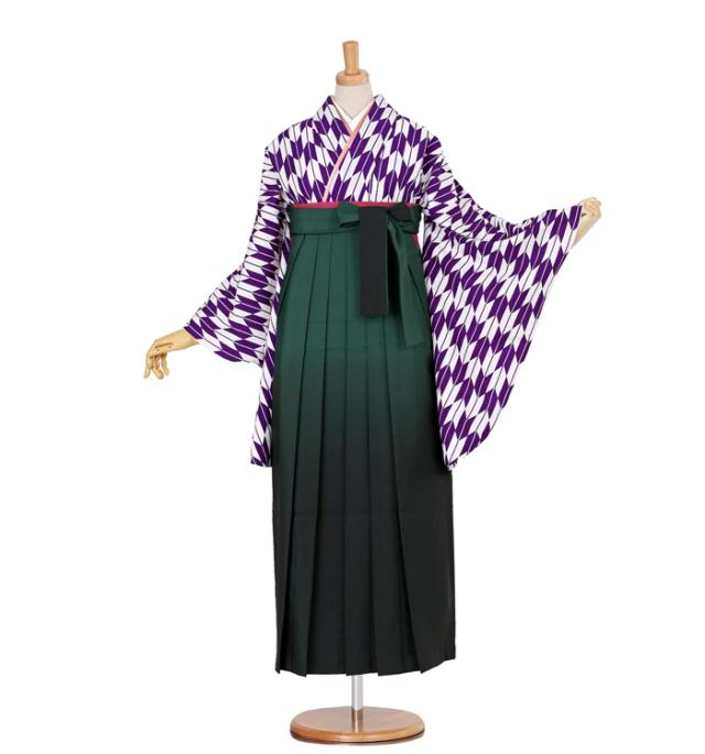 紫と白の矢絣の二尺袖と、緑ボカシの袴のセットです。