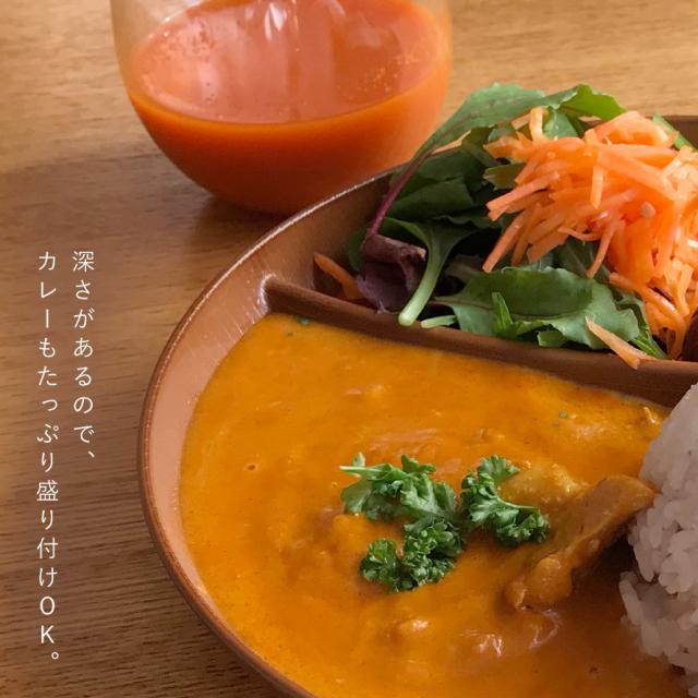 主食と副菜などをバランスよく盛り付けることができる、2つの仕切り付き。ご飯とおかずが混ざらない。深さがあるのでカレーにも使えます。