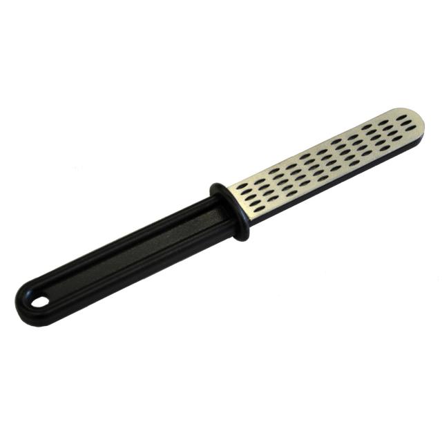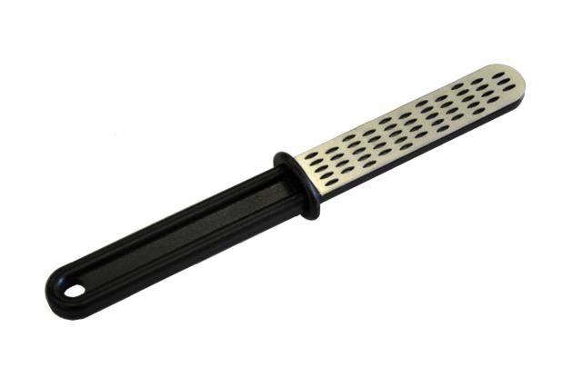 軽量で使いやすいハンディタイプのシャープナーです。シャープナー部分が両面に付いていて、荒目で数回研いでから仕上げ目で研ぐと抜群の切れ味になります。工業用ダイヤモンドを用いたシャープナーなので、一般のスチール製砥石やセラミックシャープナーに比べ数倍よく研げます。