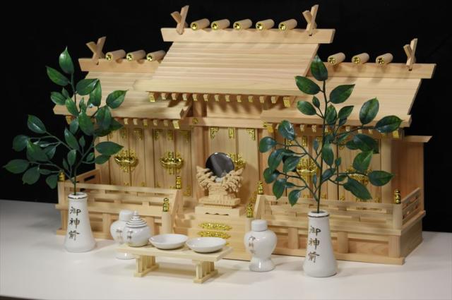 五社をお祀りする場合は設置場所の広さが必要です。この神棚は五社タイプの中でもできるだけ小型に抑えた設計となっています。屋根幅は74cm。多くのお神札をお祀りされたい方で設置スペースにお悩みの方はご検討ください。東濃ひのき製・高級神棚です。神具は金文字入りの「ご神前」陶器付き。神鏡は大変手間の掛かる上彫り仕上げ。陶器は文字なしの単色白でもお選び頂けます。 当店で販売中の別売り棚板、お買得棚板「大」または雲板・神幕付き棚板セット「大」をご利用いただけるサイズです。 付属品■ ご神前神具11点セット・上彫り神鏡 ・八足台 ・造花榊 一対 ・金文字入り陶器(榊立てx2、平次x2、水玉、皿x2)※ 陶器は金文字無し(白単色)でもお選びいただけます。ご購入後にオーダーフォーム内「ご要望」欄よりお伝え下さい。サイズ 約(cm)■神棚の大きさ高さ41 幅74 奥行き22 ■お神札が入るスペース中央:高さ30 幅14 奥行き6左右:高さ24 幅21 奥行き5 (二枚の扉で一部屋です)
