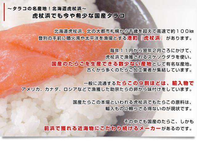 北海道の噴火湾や太平洋を漁場とする港町『虎杖浜』があります。毎年11月から翌年2月ごろにかけて、虎杖浜で漁獲されるスケソウダラを使い、国産のたらこを生産できる数少ない産地として有名な産地。古くから多くのたらこ加工業者が集結しています。原料は輸入ものに頼らざる得ない中、国産のたらこ、しかも前浜で獲れる近海物にこだわり続けるメーカーがあるのです。