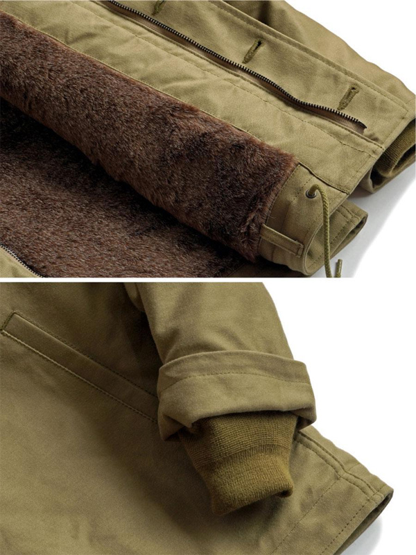遮風、防水性に優れた肉厚なコットン生地の表地、内側には全面にボアライニングを張られているのが大きな特徴。