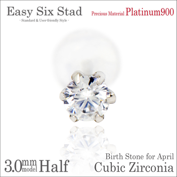 Pt900プラチナ キュービックジルコニア 3mm 薄型6本爪 スタッド ピアス 片耳単品