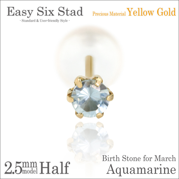 アクアマリン ピアス K10 イエローゴールド 2.5mm 薄型6本爪 スタッド 片耳単品 ダブルロックキャッチ付