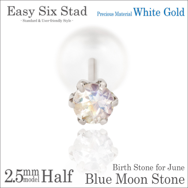 ブルームーンストーン ピアス 送料無料 K10 ホワイトゴールド 2.5mm 薄型6本爪 スタッド 片耳単品 ダブルロックキャッチ付
