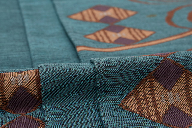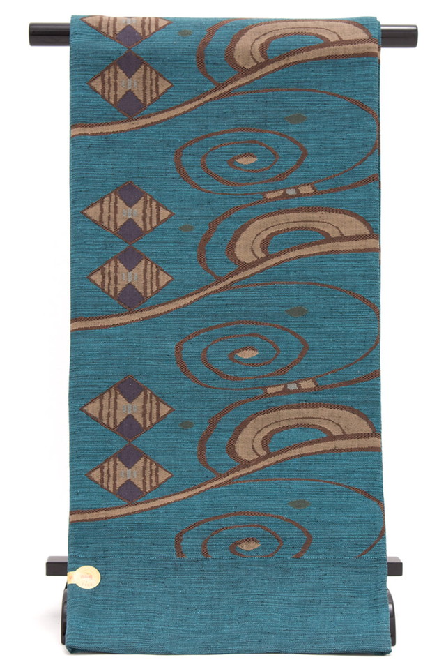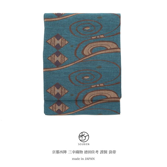 【未仕立て】 袋帯 青 ブルー 茶色 流水文 菱 幾何学 正絹 三幸織物 徳田佳考 京都西陣織 1403 おしゃれ袋帯 紬の帯 六通柄 カジュアル 日本製