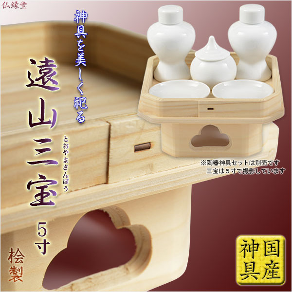 国産神具【高さを抑えた遠山三宝:桧製 5寸サイズ】 祖霊舎 神徒壇 神棚 神道 御霊舎 霊璽 御霊代