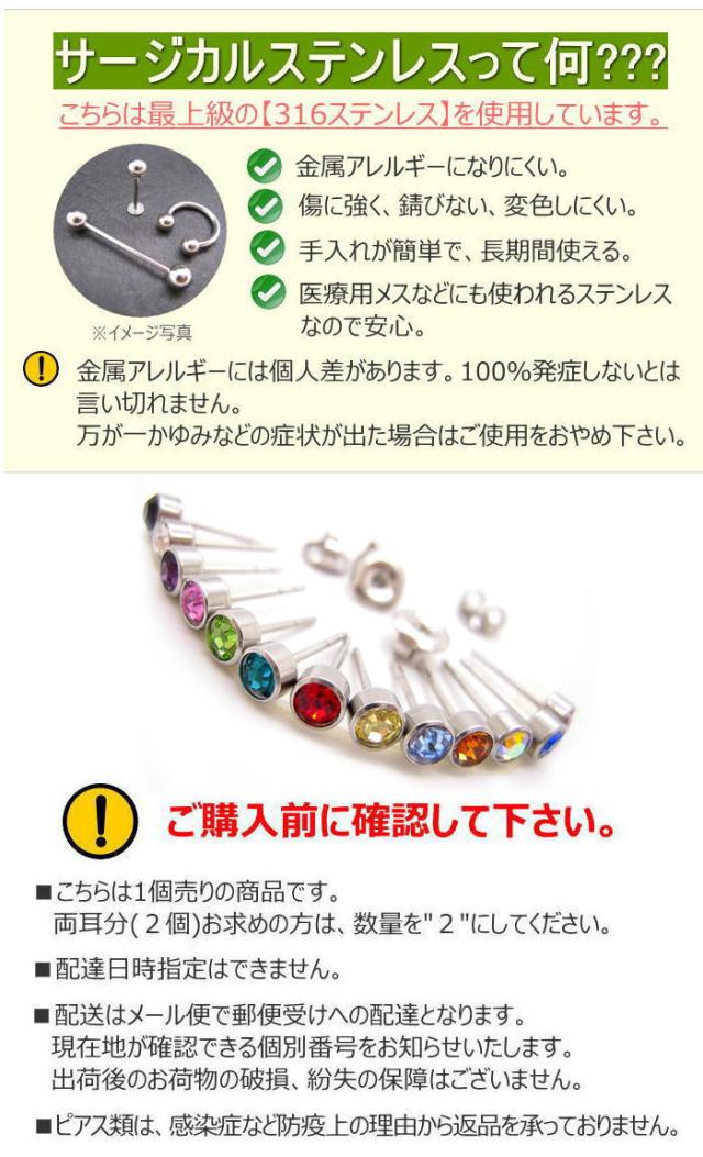 医療用ステンレスは金属アレルギー等のトラブルが起こりにくく、耳鼻科などでピアスガン用に使われる物と類似タイプなので、ファーストピアスとして安心してお使いいただけます。
