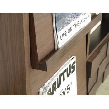 上下のフラップアップ扉がディスプレイ【仕様】になっているマガジンラック。