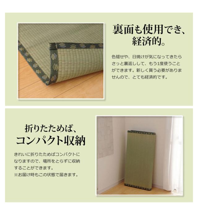 上敷きを敷くだけで畳のお部屋をリフレッシュ出来ます。日焼けしてしまった畳のリフレッシュに、新品の畳を汚さないためのカバーにご使用下さい。長さ105〜110cmの国産(九州産)い草を使用しています。そのうち約88cmを使用しています。ヘリ際はある程度白みを帯びます。(日焼けではありません、い草の根元と先端部分の色です。)い草は先端部分が赤茶色く、根元が白く真中が青(緑)色です。真中の良質な青の部分を多く使用するほど、丈夫で綺麗な仕上がりとなります。またイ草は使用するうちに日焼けをしますが、真中の青の部分を多く使用した物ほど全体が綺麗に日焼けし、味が出ます。国産(九州産)のい草を使用しています。