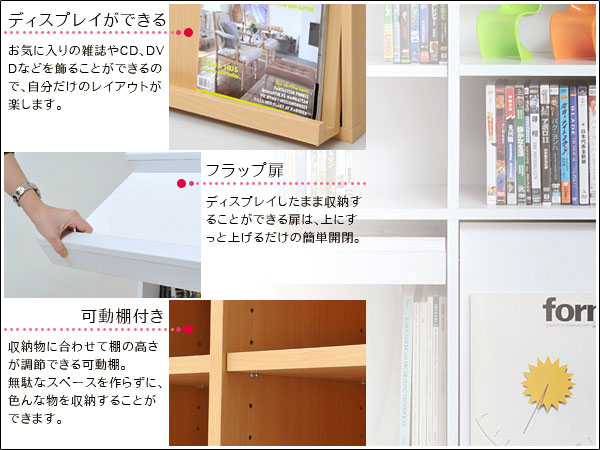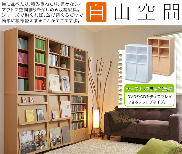 6種類のボックスを自在に組み合わせてオリジナルの壁面収納をつくれる6BOXシリーズ。リビングに最適。前面のフラップ扉には雑誌がディスプレイできます。扉内には雑誌のバックナンバー等収納して。オープン部融合タイプなので、用途はさまざまです。