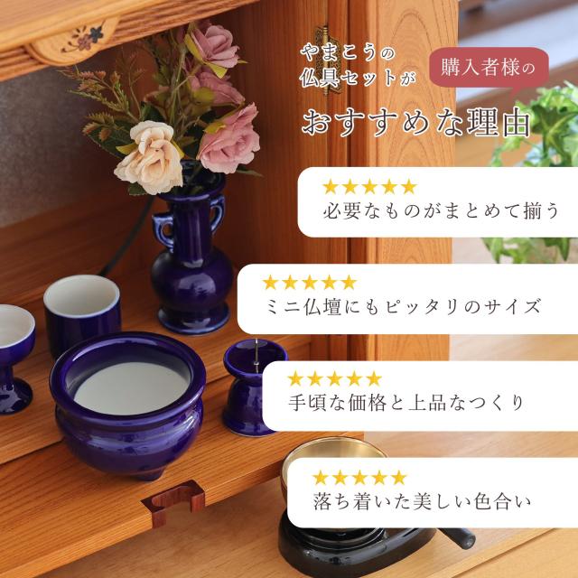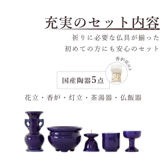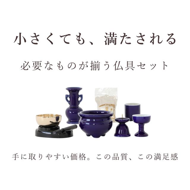落ち着いた深みのある美しいブルーが印象的な国産陶器の仏具セット。
