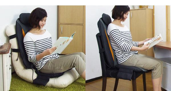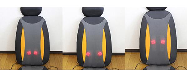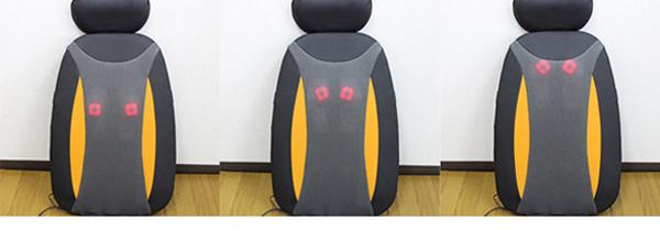 椅子や壁に立てかけ、大小2つのもみ玉が背中・腰などをマッサージしてくれます。また3コースのマッサージが選択できます。座面にバイブレーター(弱・中・強)があり選択できます。