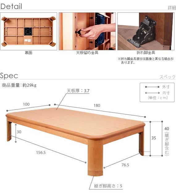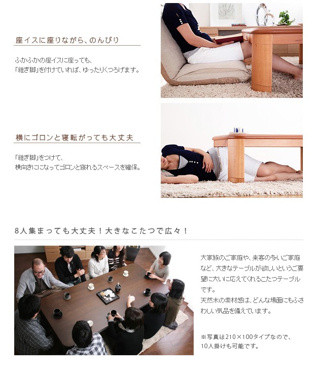 商品について:角が丸く優しさあふれるシンプルなデザイン。こたつもテーブルもこれ1台でOK♪使わないときは折畳んですき間へ収納。便利な継ぎ脚付(高さ5cm)。600W薄型石英管ヒーター(手元コントローラー式)。
