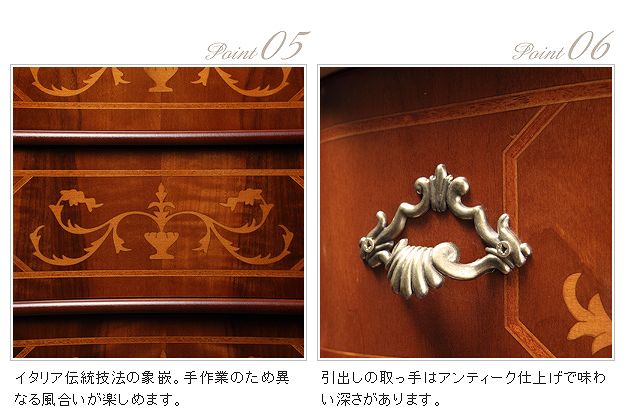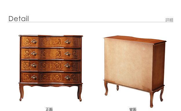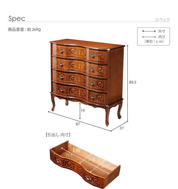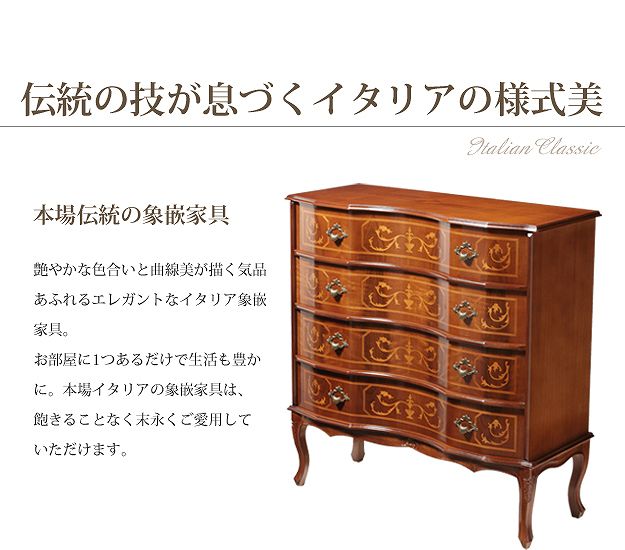 商品について:芸術作品ともいえるイタリア直輸入家具をご自宅に☆ヴェローナクラシック猫脚4段チェスト幅87cm。艶やかな色合いと、滑らかな曲線を描くフォルムがお部屋をエレガントに演出します。彫刻が美しい猫脚も魅力的。引き出しの前板にはイタリア伝統の職人技である象嵌細工が施されています。
